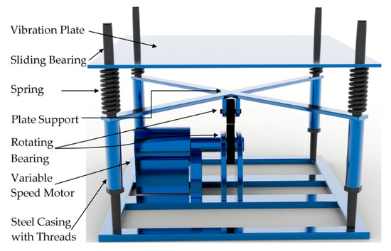 In order to simulate vehicle-induced vibrations, a vibration device was improved based on the cement mortar vibration table (ZH.DG-80, Hebei Dahong Experimental Instrument, Cangzhou, China), as shown in Figure 1. The driving force of the vibration device was provided by a triphasic variable speed motor. The speed of the motor could be adjusted by the frequency converter, and the vibration frequency of the device would then be converted. To ensure that the vibration model was presented as simple harmonic vibration, two rotating bearings with circular eccentricity were added to the vibration device.