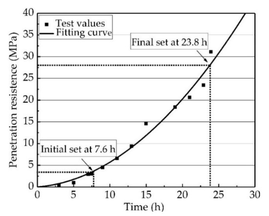 Before determining the vibration variables, a penetration test needed to be performed to determine the setting time of the PVA-ECC. The setting time of the PVA-ECC was determined based on the penetration resistance test according to JTG E30-2005. The results are shown in Figure 2. From the fitting curve of the time-penetration resistance of the PVA-ECC, the times of the initial set and the final set were obtained, which were 7.6 h (penetration resistance ≤ 3.5 MPa) and 23.8 h (penetration resistance ≤ 28.0 MPa), respectively.