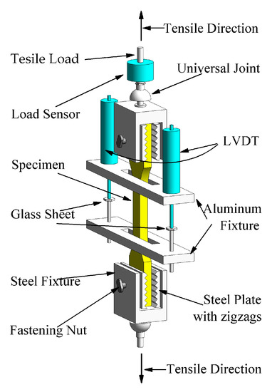 The loading device was carefully designed, as shown in Figure 3. To prevent failure occurring at the ends of the specimens caused by uneven extrusion, two steel fixtures were used to clamp the ends of the specimen to produce uniform transmission of the loads. To increase the contact area between the steel fixtures and the sides of the specimen at the ends, four steel plates with zigzag grooves were placed at the contact positions and fastened by four nuts. In order to ensure a uniaxial load and to eliminate eccentric stress for the specimen, two universal spherical hinges were installed at the top of the steel fixture, so that the geometric center line of the steel fixtures could coincide with the axis of the specimen. Before loading, two linear variable differential transformers (LVDTs) were fixed on the sides of the tested specimen with an aluminum fixture, and the measuring distance was maintained at 90 mm in the middle of specimen.