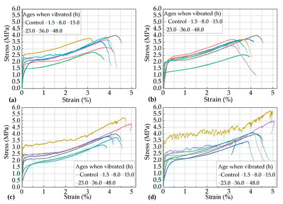The strain- stress curves of the twenty-four groups of vibrated specimens and the one group of control specimens at different ages when vibrated for 1.5 h, 8.0 h, 15.0 h, 23.0 h, 36.0 h, and 48.0 h, subjected to the combination of a constant duration of 5.0 h and different levels of vibration frequency of 2.0 Hz, 3.0 Hz, 4.0 Hz, and 5.0 Hz, are shown in Figure 4. The rates of cracking strength (σcc), ultimate tensile strength (σcu), and strain (εcu) of the variated specimens over the cracking strength (σvc), ultimate tensile strength (σvu), and strain (εvu) of the control specimens with the increase of ages when vibrated are shown as Figure 5.