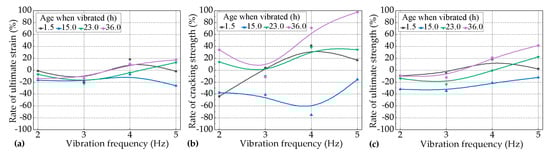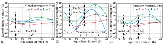 It can be seen in Figure 5b that for the vibrated PVA-ECC group subjected to the frequency level of 2.0 Hz, the most negative age when vibrated occurred at age of 8.0 h when vibrated for cracking strength. Except for this, it can be seen in Figure 5b,c that for all of the vibrated groups subjected to the frequency levels of 3.0 Hz to 5.0 Hz, the most negative ages when vibrated occurred at 15.0 h for cracking or ultimate tensile strength. This result indicates that for all of the twenty-four vibrated groups in this section, the most negative age when vibrated for the strength of the PVA-ECC occurred at the periods during the initial set and the final set.