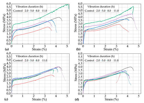 Strain-stress curves of the vibrated PVA-ECC groups subjected to different lengths of vibration duration under the combination of different levels of vibration frequency and the age of 8.0 h when vibrated and, (a) 2.0 Hz; (b) 3.0 Hz; (c) 4.0Hz; (d) 5.0 Hz.