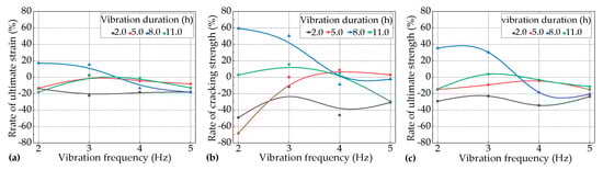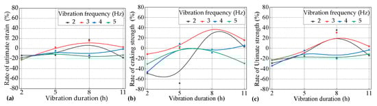 According to Figure 7a, for the vibrated PVA-ECC groups subjected to the frequency level of 2.0 Hz, the rate of the ultimate tensile strain over the control group first increased and then decreased with the increasing of the length of vibration duration. Figure 7a also show that when the vibration duration was 5.0 h, their εvu decreased by 13.29% over εcu, and when the vibration durations were 2.0 h and 11.0 h, their εvu decreased by 13.75% and 18.18% over εcu, respectively. However, when the vibration duration was 8.0 h, their εvu increased by 17.25% over εcu.