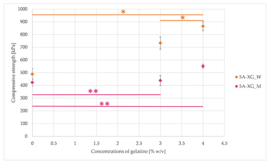 Compressive strength results for the samples dissolved in water (W) and full culture medium (M) with different content of gelatine (* = p < 0.05 and ** = p < 0.01, results statistically significant).