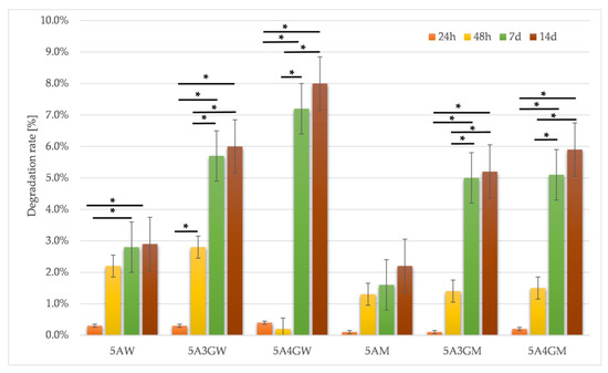 Degradation rates for samples dissolved in water (W) and full culture medium (M) with different content of gelatine evaluated after 24 h, 48 h, 7 days, and 14 days of incubation (* = p < 0.05, results statistically significant).