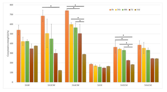 Compressive strength results for samples dissolved in water (W) and full culture medium (M) with different content of gelatine evaluated after 24 h, 48 h, 7 days, and 14 days of incubation (* = p < 0.05, results statistically significant).