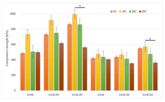 Compressive strength results for samples dissolved in water (W) and full culture medium (M) with different content of gelatine after 0 (0 C, reference samples), 10 (10 C), 20 (20 C), and 50 (50 C) cycles of loading and unloading (* = p < 0.05, results statistically significant).