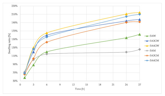 The ability to absorb liquids is an important feature of hydrogels used in tissue engineering. It involves the absorption of body fluids, as well as the penetration and transport of nutrients and metabolic products. Figure 6 presents the results of measurements of the swelling ratio of the tested hydrogels.