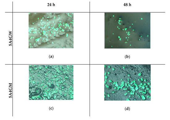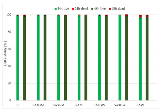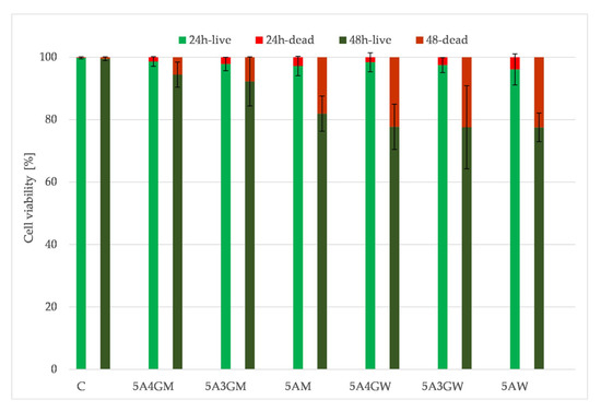 Figure 7 shows the results of the direct viability/cytotoxicity test of the hydrogels in direct contact with cells. The determined cells’ viability decreases with the prolonged incubation period of the hydrogels. However, they do not cause a cytotoxic effect (according to the PN-EN ISO 10993-5 guidelines)—the proportion of dead cells in their total amount does not exceed 30%. The decreasing viability of cells is associated with the decreasing amount observed on the surface, which may result from their penetration into the interior of the tested samples at various depths. The highest viability after both incubation periods was obtained for the 5A4GM hydrogel. The use of full culture medium as a solvent for the hydrogels preparation stage ensures higher cell viability and their proliferative capacity. The introduction of gelatine also increases cell viability, but it also depends on the solvent used. In the case of a culture medium application, this tendency is stronger, whereas in case of water this trend is maintained at an incubation period of 24 h. After 48 h, the viability of cells seeded on hydrogels prepared with water remains at the same level.
