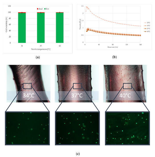 Apart from the concentration of sodium alginate and gelatine and the type of solvent, the rheological properties of hydrogels are also affected by their temperature. As our research showed (Figure 10), the higher it is, the lower is the viscosity of the material being tested. The introduction of the nozzle heating allowed us to control the temperature of the extruded hydrogel. In terms of the use of hydrogels in bioprinting for tissue engineering needs, this is important due to the fact that it makes it possible to use materials with higher content of various components (as e.g., attractants or cells’ growth factors) and thus also with higher viscosity. Their extrusion becomes possible by changing the temperature. Additionally, what is very important, heating hydrogels to 34, 37, and 40 °C does not significantly affect cell survival. Furthermore, when the nozzle was heated to 40 °C, the highest cell viability was obtained. This is due to the fact that at this temperature the viscosity of the tested hydrogel is the lowest and the lowest shear stress is generated. Nevertheless, this temperature must be selected so as not to cause thermal destruction of the cells. For printouts with a nozzle temperature of 34 °C, cell viability decreased, what is related to the increasing viscosity.