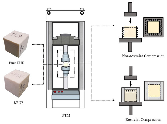 There were two types of the rigid PUF specimens used in this study: pure polyurethane foam (pure PUF) and glass-fiber-reinforced polyurethane foam (RPUF). The pure PUF and RPUF specimens were manufactured by adding a foaming agent to polyol and isocyanate, followed by mixing and blowing using a homogenizer. Both the pure PUF and the RPUF are classified as the same polymeric foam with three-dimensional network structures and urethane bonds during the foaming process. The difference between the two materials is that the glass fibers are added during manufacturing in the latter. These fibers decrease the insulation performance but increase the strength performance against a compressive load. Therefore, RPUF was used for control purposes to determine the validity of the restraint conditions proposed in this study. Table 2 lists the specimen properties; the dimensions were commonly selected in the form of a cube of 50 mm × 50 mm × 50 mm according to the compression test standard.