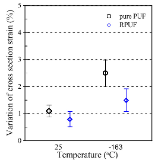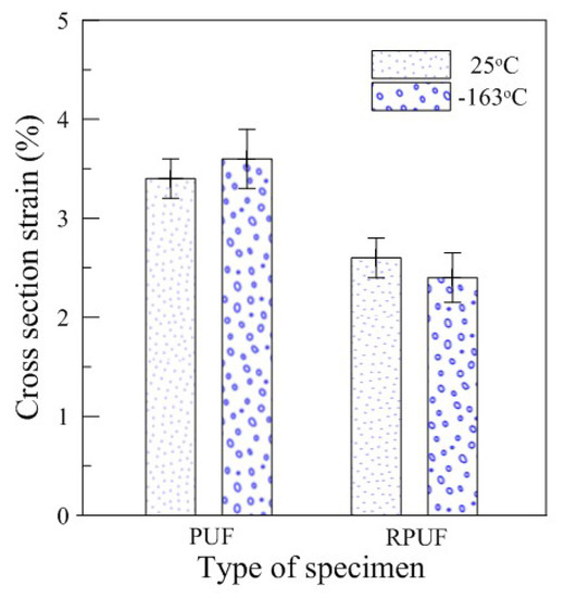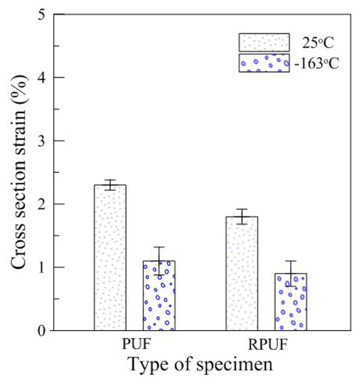 Figure 6 shows the tendency of the cross-section deformation measured after the test using conventional compressive test methods. After the test was performed, the quantitative values were arranged as shown in Table 4 for comparative analysis of the permanent deformational values remaining in the test specimen after sufficient strain recovery was achieved. As shown in Figure 6, the cross-sectional strain values of the pure PUF and RPUF showed a difference of approximately 1% between the specimens because of the presence of glass fibers that improved strength performance. However, it was found that the temperature-dependent sectional deformation was not significantly different. In particular, compared to the deviations of the tests repeated five times, it was found that both types of specimens showed only a limited difference of 0.2% between 25 and −163 °C, and that the trends of the results were largely consistent with no apparent temperature-induced effects.