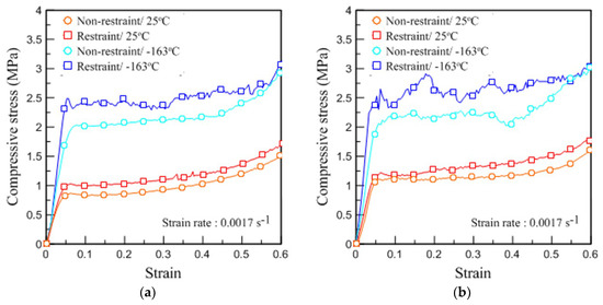 Figure 10 shows the mechanical behavior of the rigid PUF, depending on environmental conditions, in stress–strain curves. Figure 10a,b show the experimental results performed under static compression loads given the same strain rate of 0.0017 s−1 for pure PUF and RPUF, respectively. In Figure 10b, in which a restraint was added, the compressive strength () of the pure PUF increased regardless of the temperature change. The RPUF also showed that its overall mechanical strength, including the yield strength, improved given the trends in the results as shown in Figure 10b.