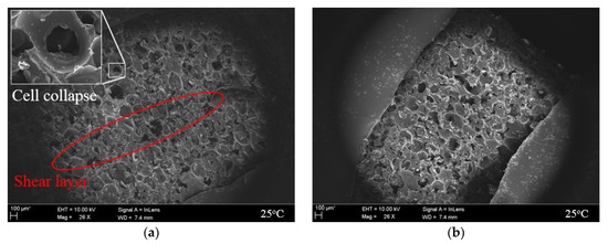 As shown in Figure 12a, cells that comprised the inside of the rigid PUF were folded, and it was difficult to identify the structural geometry because of the buckling. In addition, it was confirmed that a shear layer by the collapsed cells formed [56]. Because it is not constrained by deformation, it is believed that a portion of the force acting in the compressive direction caused the shear. In contrast, Figure 12b shows that, by adding a four-sided restraint to the side of the specimen, they were scattered with fractures of the cell structure compared to Figure 12a. The proportion of cell collapse shown through the compression experimental method proposed in this study also decreased compared to that of the existing test. However, because of the nature of soft segments that are not significantly involved in load support at 25 °C, the effect of suppressing the overall deformation obtained through restraint was not deemed to have influenced the prevention of buckling through cell windows.