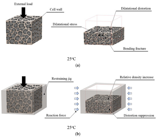 However, in the case of Figure 14b where the restraint was added, the distortion pattern is different from Figure 14a. The restraining jig on the side exerts a reaction force to suppress structural distortion. This action appears to have effectively controlled the dilatational stress induced by the external load. Thus, blocking the critical strain means managing the failure risk by increasing the relative density of the material and obtaining the advantage that the strength performance is improved, as shown in Figure 10.