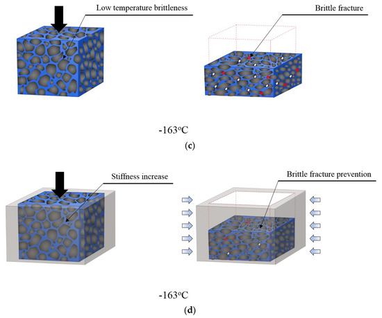 Finally, Figure 14d shows how the confining effect was in the cryogenic environment when a compressive load was applied. As shown in Figure 14b, the restraining jig blocked the distortion of the cell but was not involved in the stiffness of the cell walls directly subjected to stress. In contrast, as shown in Figure 14d, the rigidity of the cell window including soft segments increased and resulted in a positive effect on material strength. In short, the cell structure simply became brittle, as shown in Figure 14b, and it was exposed to a situation where it was easily fragile when subject to external or expansion pressure. However, it could reduce cell tears in an environment where deformation was artificially suppressed. This means that the restraint applied to the low-temperature environment suppressed the unstable dilatational distortion inside the cell, thereby alleviating the risk of brittle fracture.