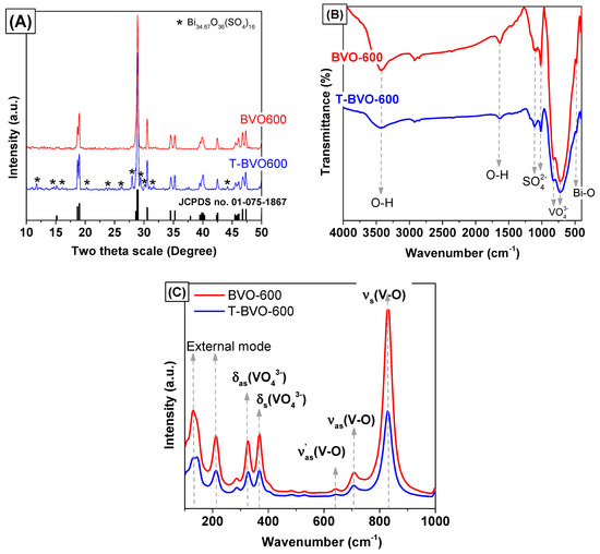 To investigate the presence of functional groups and bonds in the material structure, the material was analyzed by FT-IR, as shown in Figure 1B. In general, both T-BVO-600 and BVO-600 samples have characteristic vibration peaks for m-s BiVO4, which is consistent with the FT-IR results for the BiVO4 material in the previous study. These peaks are the stretching vibration (δ) and bending vibration mode (υ) respectively, of the O–H bond of the water molecules adsorbed onto the surface of the material [22], the bending vibration of the Bi–O bond [23], the stretching vibration of the group [22,23], and the asymmetric stretching vibration of V=O [24]. Also, the presence of the group on the T-BVO-600 sample was detected through FT-IR spectra at wavenumbers of 1110 and 1016 cm−1, corresponding to the asymmetric and symmetric stretching vibrations of S=O bonds [25].
