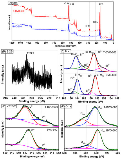 Full scan (A), S 2s (B), Bi 4f (C), V 2p3/2 (D), and O 1s (E) X-ray photoelectron spectroscopy (XPS) spectra of T-BVO-600 and BVO-600.