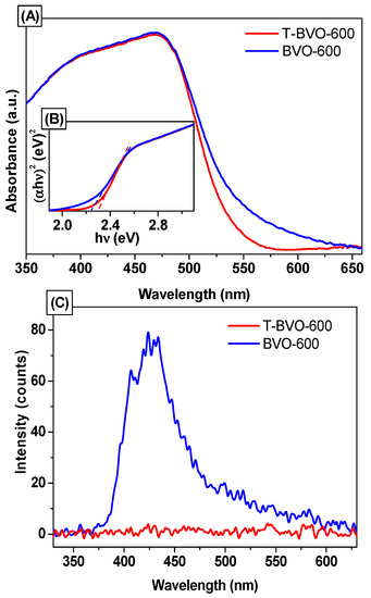 Ultraviolet-visible diffuse reflectance spectroscopy (UV-Vis DRS) spectra (A), (ahν)2–hν curves (B), and photoluminescence (PL) spectra of T-BVO-600 and BVO-600 (C).