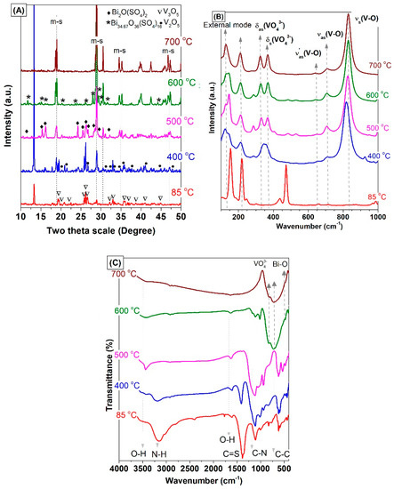 XRD pattern (A), Raman spectra (B), and FT-IR spectra (C) of the BiVO4 amorphous (85 °C) and sulfate-modified BiVO4 annealed at 400, 500, 600, and 700 °C.