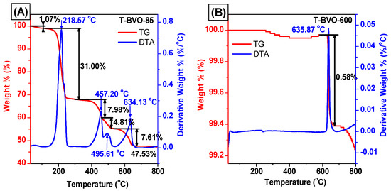 TG analysis was performed to observe the physical and chemical processes that occur when the T-BVO-85 sample was processed at different temperatures as well as the purity of the T-BVO-600 sample. Figure 7 shows the weight loss curve of T-BVO-85 and T-BVO-600. From the TGA curve shown in Figure 7A, the T-BVO-85 has five mass loss processes occurring when the sample is heated from room temperature to 800 °C. The first loss of mass occurs from room temperature to 100 °C with a weight loss of 1.07%, corresponding to the removal of adsorbed water on the surface of the material. The second mass loss process in the range of temperature from 100 °C to 300 °C, related to the decomposition of thiourea, corresponds to approximately 31.00% of the weight loss. The third mass loss in the temperatures range from 300 °C to 470 °C is due to the decomposition of the nitrate salts with a mass loss of about 7.98% [47] The fourth mass loss in the temperature range from 470 °C to 540 °C involves complete oxidation of carbon residue in the sample with mass loss of about 4.81%. The fifth mass loss in the region from 540 °C to 680 °C is the transition between the tetragonal and monoclinic phases, which is accompanied by a weight loss of about 7.61%. The differential thermal analysis (DTA) curve of the T-BVO-85 shows five exothermic peaks, corresponding to five mass loss processes on the TG curve. The sharply exothermic peak at 218.67 °C with significant weight loss in the TG curve is attributed to the decomposition of the thiourea because the decomposition reaction of thiourea is the exothermic reaction. For the T-BVO-600 sample (Figure 7B), only one mass loss occurred during the high-temperature range of 605 °C to 690 °C, corresponding to the phase transition between the tetragonal and monoclinic phases. The weight loss accounts for about 0.68%. In addition, no other mass loss occurred at lower temperatures, indicating that thiourea and nitrate salts were decomposed entirely in the sample when the sample was heated at 600 °C.