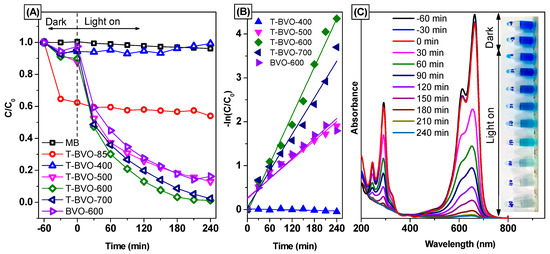 Figure 8C shows the change in the UV-vis absorption spectrum of MB over time in the presence of T-BVO-600. As the lighting time increases, the maximum absorption peak of MB at 664 nm decreases. The decrease in MB concentration was also observed through the dark blue of the MB solution, which began to fade, and the blue color was almost completely lost when the lighting time increased to 240 min. In addition, there is no increase in the absorption peak in the UV region of MB during irradiation, suggesting that most MB has completely decomposed. The high photocatalytic activity of T-BVO-600 indicates that it can be widely used in the treatment of wastewater containing organic dyes.