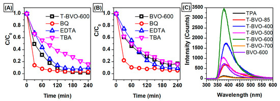 Trapping experiments of photocatalytic degradation of MB over (A) T-BVO-600, (B) BVO-600 samples (BQ: 1,4-benzoquinone, EDTA: ethylenediaminetetraacetic acid disodium and TBA: tert-butanol) and (C) PL spectra of terephthalic acid (λex = 315 nm) in the presence of BiVO4 samples.