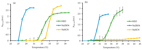 Homopolymer, PNIPAAm (5 mg) was dissolved in 5 mL of deionized water, 0.1 M NaSCN, and 0.1 M Na2SO4, respectively. The absorbance at 350 nm (A350) was recorded for temperatures that ranged from 25 to 45 °C. The experiment was done in duplicate.