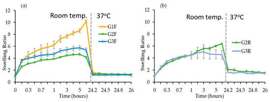 The SR was determined for PNIPAAm gels prepared while using a different amount of crosslinkers (Figure 3). The swelling profile rate of the FRP gels consists of an initial burst phase, followed by a sustained swelling (Figure 3a). For gel G1F (i.e., 2.5 mol.% of crosslinker), the SR reached ~10.1 after 24 h at room temperature, whereas the ratio of G2F and G3F decreased by a factor ~2 (i.e., 4.7 and 5.7, respectively), due to the higher amount of crosslinker that renders the polymer network much denser when compared to that of GF1. Furthermore, the SR of the gels that were prepared using RAFT polymerization with 5 (G2R) and 10% mol. (G3R) of crosslinker were found to be 6.4 and 5.0, respectively (Figure 3b), hence demonstrating the dependence of the SR with the amount of crosslinker again. To be noted, the SR of G1R could be not evaluated because of the lack of gel consistency; we believe that this constitutes indirect evidence that non-defined chemical entanglement from side reactions (i.e., chain-chain crosslinking) contribute to the formation of gels by FRP; this explains the inability of RAFT to form gels at lower crosslinker feeds, simply because the reaction mechanism is more well-defined with a minimization of side-reactions [34] leading to better defined crosslinks overall and this is also corroborated by the difference between the SR of FRP and RAFT gels. RAFT polymerization allows for the incorporation of chemical crosslinks in a highly controlled manner, hence forming a well-defined hydrogel network [21,22,23,24,25,26]. Finally, after 24 h, the temperature was increased to 37 °C, and the SR of each gel instantly dropped to 1 due to the loss of PNIPAAm solubility in water above 32 °C.