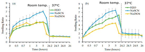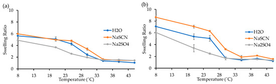 The gels G2R and G2F were used to investigate the influence of temperature on their swelling properties in distilled water, NaSCN and Na2SO4 solution, respectively. The SR of each gel was measured at different temperatures, as shown in Figure 6. In both cases, the SR decreases with the increase of the temperature with a higher decrease slope around the LCST onset for both samples. At 35 °C, the SR of the gels G2F (Figure 6a) immersed in water, NaSCN and Na2SO4 solution respectively was found to be ~1, indicating the complete loss of the water uptake. At 8 °C, a SR of 4.9, 5.6 and 6.0 for G2F was found in Na2SO4 solution, water and NaSCN solution, respectively (Figure 6a). G2R had considerably higher SR values at 8 °C, namely, 6.1, 7.0, and 8.7, at Na2SO4, NaSCN, and H2O, respectively (Figure 6b).