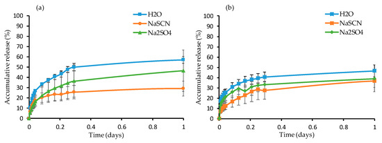 Another set of gels was synthesized with 5 mol.% of crosslinker in 1 mL of solvent while using FRP and RAFT polymerizations, in which 2 wt.% of fluorescein was loaded. The gels were immersed in water, 0.1 M NaSCN, and 0.1 M Na2SO4 solution at room temperature and 37 °C. An aliquot was collected every 10 min. during the first hour, followed by aliquot collection every hour and were analyzed while using UV-vis spectroscopy to measure the release (Figure 7).