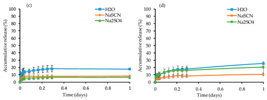 For all gels, the release profile rate was sustained following an initial burst release phase. The FRP gels had higher release rate in water and Na2SO4 solution at room temperature (Figure 7a) than 37 °C (Figure 7b) due to the loss of PNIPAAm solubility above 27 °C (in Na2SO4) and 32 °C (in water). More specifically, 56.9% and 46.4% of fluorescein was released in water and Na2SO4 solute, respectively, at room temperature after one day while 46.5% and 38.9% was released at 37 °C. However, the release rate of fluorescein was higher in the NaSCN solution at 37 °C than at room temperature and this can be attributed to the increase of the LCST of PNIPAAm in NaSCN as previously shown; in fact, 36.1% and 29.0% of fluorescein was released in NaSCN at 37 °C and room temperature, respectively. For the RAFT gels (Figure 7c,d), the release rate in each medium was higher at 37 °C than room temperature. Only 17.9%, 6.6% and 8.3% of fluorescein was released in water, Na2SO4, and NaSCN at room temperature (Figure 7c) after one day, whereas the release was found to be 25.6%, 20.4%, and 10.4%, respectively, at 37 °C (Figure 7d). The increase can be due to the gel contraction, which presumably enhances the fluorescein release in the solute above the LCST of PNIPAAm.