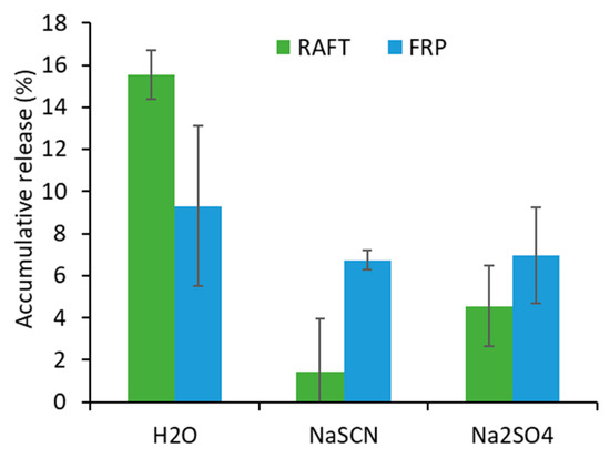 The percentile release of fluorescein from the FRP gels was found to be 9.3%, 6.7%, and 6.9% in water, NaSCN, and Na2SO4 solutions, respectively after four days. However, the differences were not statistically significant indicating no influence of the medium on the hydrolytic stability of the FRP gels. On the other hand, 15.5%, 1.4%, and 4.6% of fluorescein was released after four days in water, NaSCN, and Na2SO4 solutions, respectively, from the RAFT gels. The release of fluorescein was significantly enhanced in water when compared to that in NaSCN and Na2SO4, although the difference of release was not significant in NaSCN and Na2SO4. The RAFT gels were hydrolytically more stable in both NaSCN and Na2SO4 solution than in water. When comparing the gels’ stability as a function of the polymerization mechanism, we found that the RAFT gels were less stable in water but more stable in the NaSCN solution as compared to FRP gels, while a similar stability in Na2SO4 solution was highlighted. It should be noted that the fluorescein molecule is linked via an ester bond on the polymer backbone, which is hydrolytically less stable than the amide NIPAAm monomer units and the crosslinker moieties. Therefore, this study does not reflect the actual hydrolytic stability of the polymer network, but rather gives an indication of the capacity of the network to retain pendant units from co-monomer synthons, which is a common synthetic strategy in hydrogels’ design—that is, NIPAAm is often combined with other co-monomers to incorporate additional functionalities on the final product.