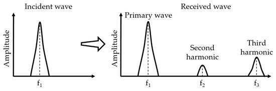 To detect the corresponding higher-order harmonic frequency components primarily, the bandwidth of the receiving transducer should cover the frequency range. In the spectrum of the signal, it can be found that second harmonic wave at the quadratic frequency at 10 MHz and third harmonic wave at the triple frequency at 15 MHz. The sensor conditions are listed in Table 2.