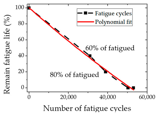 KR 60 rails are widely used in Korean transport systems. The material properties are listed in Table 1 [24]. The specimen used in this study is a rectangular bar of 350 × 30 × 60 mm3 in rail head. Three-point bending fatigue tests were performed on the specimens. The load was 12 ton and the fatigue cycle was 2.5 Hz. In order to measure the fatigue life of the specimen, the fatigue cycle was measured by using two control specimens up to failure was about 51,700 cycles on average. Based on the fatigue life curve as depicted in Figure 4, fatigue test specimens of 60% and 80% were prepared based on the life span of undamaged test specimens and fatigued specimen.