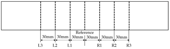 High-order harmonic longitudinal wave and wave mixing tests are applied to seven detection points defined at the same distance in the central region (see Figure 5). Use the high-power tone burst system to generate narrowband signals at seven detection points. The transducer is mounted on the specimen with couplants and consistent pressure to ensure constant contact conditions. Signal processing uses the Fast Fourier Transform (FFT) to obtain the spectrogram.