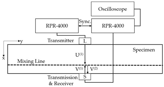 It should be noticed that due to the difference in wave speed, the mixing line is close to the bottom shear transducer. The mixing time T is , which can be calculated directly by the equation , where, is the height of the specimen equal to 60 mm. Obviously, the distance between mixing lines and the shear transducer is about 20 mm as depicted in in Figure 7. Certainly, it is feasible for defining a mixing line in the random position with time delay.