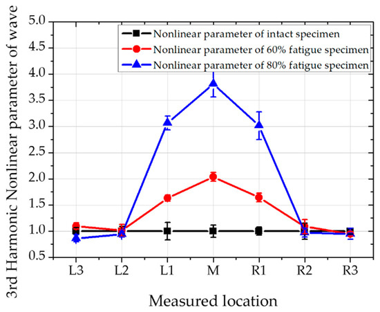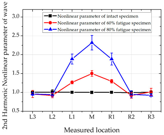 The higher harmonic nonlinear parameters are compared as seen in Table 4. The ratio of nonlinear parameters is listed at each of the measured points. At the fatigue status, the nonlinear parameters at third harmonics are generally bigger than second harmonics. Interestingly, at the measured point of L1 and R1, the ratio of second and third harmonic nonlinear parameters become greater at 80% of fatigue status than 60%. Therefore, it can be assumed that as fatigue cycles are increased, third harmonic nonlinearity becomes sensitive than second harmonics