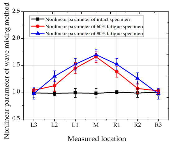 The nonlinearity of the wave mixing method for these fatigue test specimens is much clearer and more remarkable than the second harmonic longitudinal test method, and the value of the nonlinear parameter at the center portion is lower than that described later. The advantage of third harmonic nonlinear parameter measurement and wave mixing nonlinear method is clearly can see in the results by comparing L2 and R2 values in Figure 8, Figure 9 and Figure 10. It is obvious that the maximum nonlinear value appears in the maximum deformed location, central location of the specimen. However, the measured location is getting further from the central location, only wave mixing technique can clearly differentiate the status of fatigue through the specimen. Obviously, wave mixing is more accurate by eliminating nonlinearities in the system.