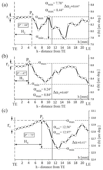 The α angle (Figure 1c) was determined point by point along the camber line applying the Ω-scan method with the use of an X-ray Freiberg Instruments EFG diffractometer [28]. An X-ray tube with a Cu anode was used. The surface area covered by X-ray beam was 0.7 mm in diameter. The average measurements error was 0.02°.