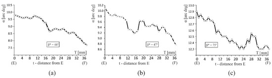 Figure 4 presents examples of the α distribution along the T axis of an airfoil. The distance t = 0 corresponds to the E point that is located on the plane of which the platform of the blade root is part of (Figure 1a). It can be seen that the α angle decreases with local changes from the E point (t = 0 mm) to the F point (t = 37 mm). It can be concluded that the force directing effect in the thin-walled area ML occurs, and it is progressing from the root platform towards the tip of the blade.