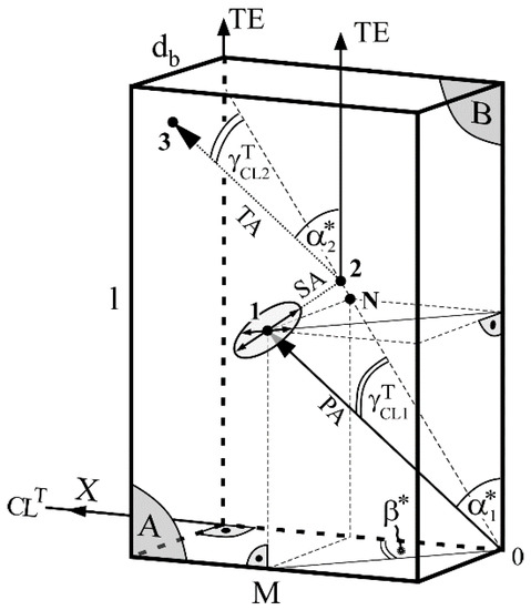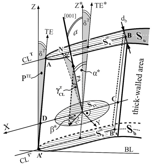 Let’s consider in detail the geometric relationship between the inclination of lateral surfaces in an airfoil thin-walled area ML and the most important angles defining the [001] direction which is specific for the growth process of the PA. The scheme presented in Figure 5 will be helpful for analysis. The following details are important for further consideration: The Z* and Z axes in Figure 5 are perpendicular to the planes , and SXY. The TE* is parallel to the TE. The CLT and CLT’ are parallel to the X axis. The X axis is perpendicular to the Y axis. The TE is inclined to the Z axis by the δT angle. The surface PTE is perpendicular to the CL, CLT’ and X. The BL in Figure 5 is the same baseline presented in Figure 1c. The PA are presented in Figure 5 by the PA unit-vector in order to visualize their growth direction only. The angle between the PA and Z* axis is marked by the α angle. The growth direction of the PA was always taken as parallel to the [001] crystallographic direction, as it is often assumed [28,29]. Recent studies [30] show that the difference in the direction of dendrite growth correlates with difference in crystal orientation, which confirms the above assumption. Since the TE is parallel to the TE*, the angle between the PA and the trailing edge TE may be denoted as the α* angle (Figure 5). The fragments AB and AʹBʹ of the CL in the thin-walled area ML (Figure 1b) are parallel straight lines for the studied type of blades. In Figure 5, the N point is the orthogonal projection of the PA vector end on the ABCD plane, formed by the X axis and the TE, arranged parallel to the mould walls. is the angle between the PA and the mould wall.