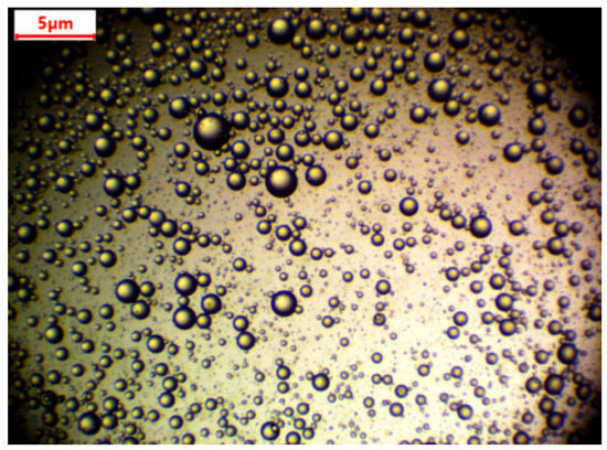A digital microscope (Levenhuk Digital Microscope, Prague, Czech Republic) was used for the determination of oil droplet size (Figure 2). The emulsion was kept for one week without any stirring. Droplet size was then measured. There was no change in the size of the droplets. Average drop size was found to be 1.05 ± 0.34 µm.