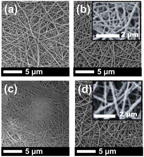It was observed that the fiber diameter did not change with increasing nanofiber web density (Figure 3, Table 1). Since spinning conditions remained the same, only the backing paper speed was changed to get various nanofiber web densities, which did not influence fiber diameter. On the other hand, treatment of the PVDF nanofiber with an alkaline solution yielded a slight increase in fiber diameter because of swelling of the fibers (Figure 4a,c). Figure 4b,d show that TiO2 nanoparticles distributed very well on the surface of the nanofiber without any aggregation, showing that a regular dehydrofluorination took place. Hydrophilic OH groups on the membrane attached to the TiO2 nanoparticles. The fibers became thicker after the TiO2 nanoparticle attachment on the surface.