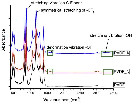 The FTIR spectra were collected in order to investigate the chemical structure of the PVDF nanofibrous webs. These are shown in Figure 5. The stretching bands at 1173 cm−1 and 876 cm−1 were attributed to the –CF2 and C–F groups of PVDF. The spectra confirmed the presence of –OH groups after surface modification, with absorption bands at 1600 cm−1 representing –OH group deformation vibrations. The very broad and less intense peak between 2500 cm−1 and 3500 cm−1 was due to O–H functionalities. It may be concluded that the bonded –OH groups played a major role in the hydrophilicity of the membranes.