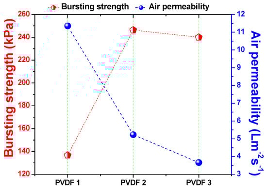 Air permeability of the membranes was measured after the lamination process. The main aim of this step was to observe whether the adhesive blocked the pore size of the nanofibers during lamination. The bursting pressure test is another method of determining the quality of the lamination process. Using this test, the strength of the lamination was measured. Figure 6 shows the relationship among density of the nanofiber layer, air permeability, and bursting pressure.