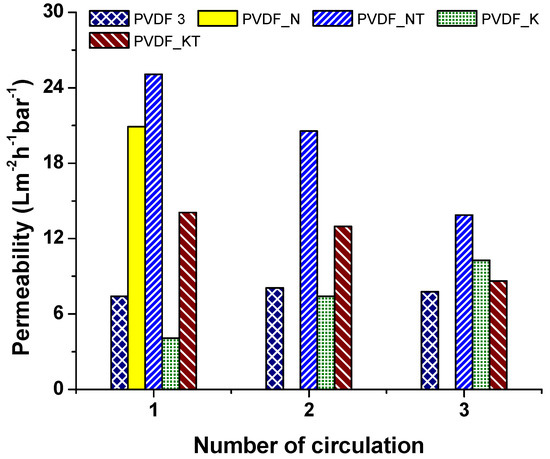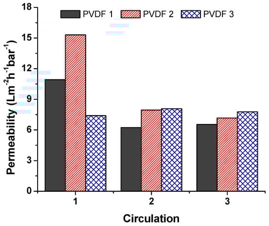 A separation test was run using dead-end cell separation, and the permeability of the unmodified membranes was calculated according to Equation (2). Results are given in Figure 7, which compares unmodified membranes at various densities. Each membrane was used and circulated three times to measure fouling. Between each circulation, distilled water was filtrated. Results indicated that, at the beginning, PVDF 2 showed enormous permeability compared to the others. The lowest permeability was achieved using PVDF 3 at the first circulation. However, membranes PVDF 1 and PVDF 2 showed a sharp decrease in permeability with the second circulation; the reason for this was membrane fouling. The membrane with the highest nanofiber density (PVDF 3) showed a stable permeability after three circulations; this could have been due to the high specific surface area of PVDF 3. A higher density meant more nanofiber web was on the structure, resulting in a bigger surface area in total. On the contrary, Hobbs et al. [23] found that there is a proportional relationship between flux decline ratio and membrane surface area. A higher surface area showed a higher flux decline ratio.