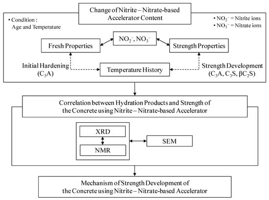 Therefore, in this study, diverse physicochemical reviews were performed in order to clarify the relationship between the hydrate formation behavior and the strength development characteristic at the early age and later ages. These hydrate formations are the result of adding nitrite–nitrate based accelerators, which are anti-freezing agents, to concrete in varying amounts. Specifically, a physical experiment was carried out on a concrete mixture where the quantity of the nitrite–nitrate based accelerator was correlated with fluidity, compressive strength, and changes in internal temperature across time. Microanalyses using X-ray diffraction (XRD), nuclear magnetic resonance (NMR), and scanning electronic microscope (SEM) were carried out for quantitative comparative analyses of the strength development characteristics. Moreover, these analyses increased the understanding of the formation behavior of the hydrates. Figure 1 shows the flow chart for this study.