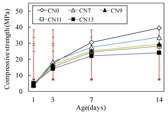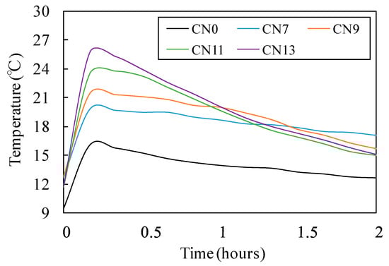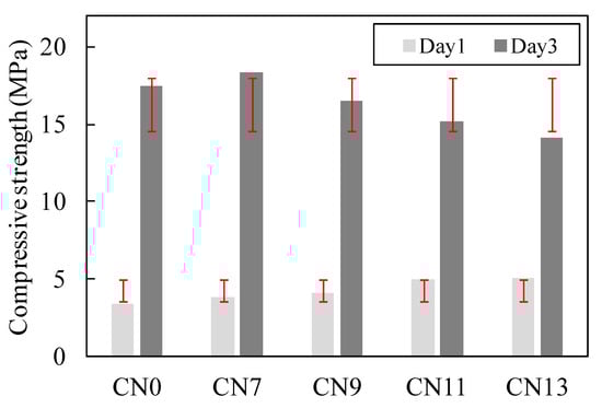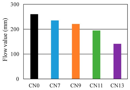 Flow results shown in Figure 3 are 260 mm for CN0, 240 mm for CN7, 220 mm for CN9, 190 mm for CN11, and 140 mm for CN13. These finding suggest that fluidity tends to decline as the amount of CN increases. It is noteworthy that the flow value of CN0, to which CN was not added, was 260 mm, while the flow value of CN13, with 13% CN, was 140 mm, indicating an approximate 46% reduction in fluidity. The highest internal temperatures of the mortar specimens immediately after the mixing process were, as shown in Figure 4, 16.1 °C for CN0, 19.8 °C for CN7, 21.4 °C for CN9, 23.8 °C for CN11, and 25.7 °C for CN13, indicating a positive correlation between the amount of CN added and the rate at which the internal temperature rose after the mixing process. In particular, the internal temperature of CN13 increased to 25.7 °C, approximately 10 °C higher than the internal temperature of CN0, which was 16.1 °C.