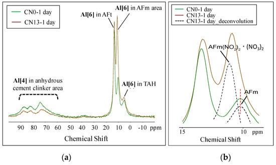The peak height and area of Al {4} at Day 14 were similar to the patterns exhibited at Day 1 (Refer to Figure 10a). However, as shown in Figure 10b, the Al {6} range, the AFt peak was lower compared to the Day 1 peaks for both CN0 and CN13, whereas the peak area of AFm increased. Further, in the case of CN0, the amount of increase in AFm was slightly higher compared to its value on Day 1. However, relatively speaking, the peak area of CN13 was large, and the differences in the center of the peak, resulting from the presence and absence of CN, were noticeable. In addition, with respect to TAH at 5 ppm, the relative area slightly decreased over time in the case of CN0, and, in contrast, increased over time for CN13. It should be noted that TAH, a phase separate from the amorphous and irregular aluminate hydrate or calcium aluminate hydrate, may form from surface precipitates of C-S-H [19,23].